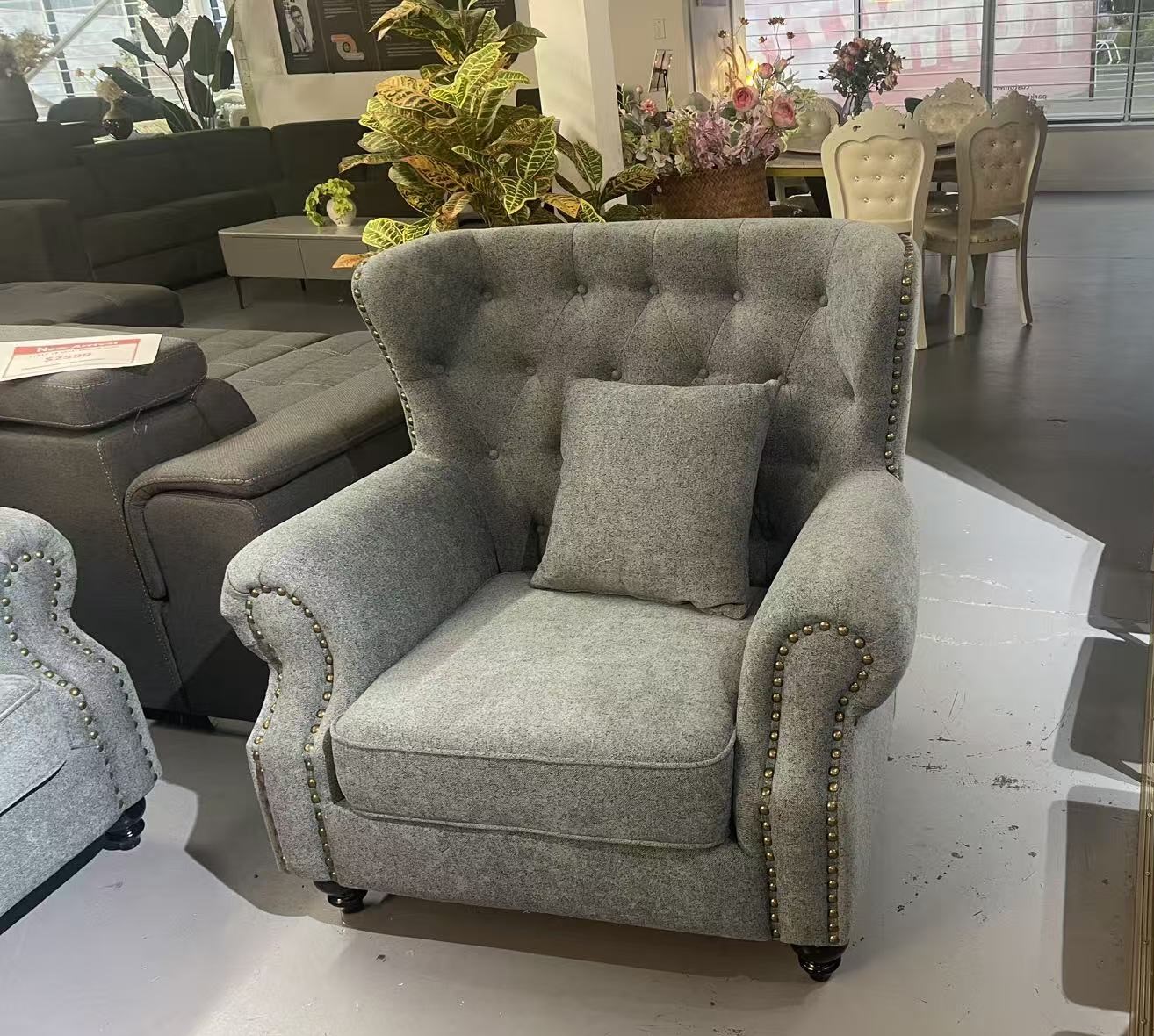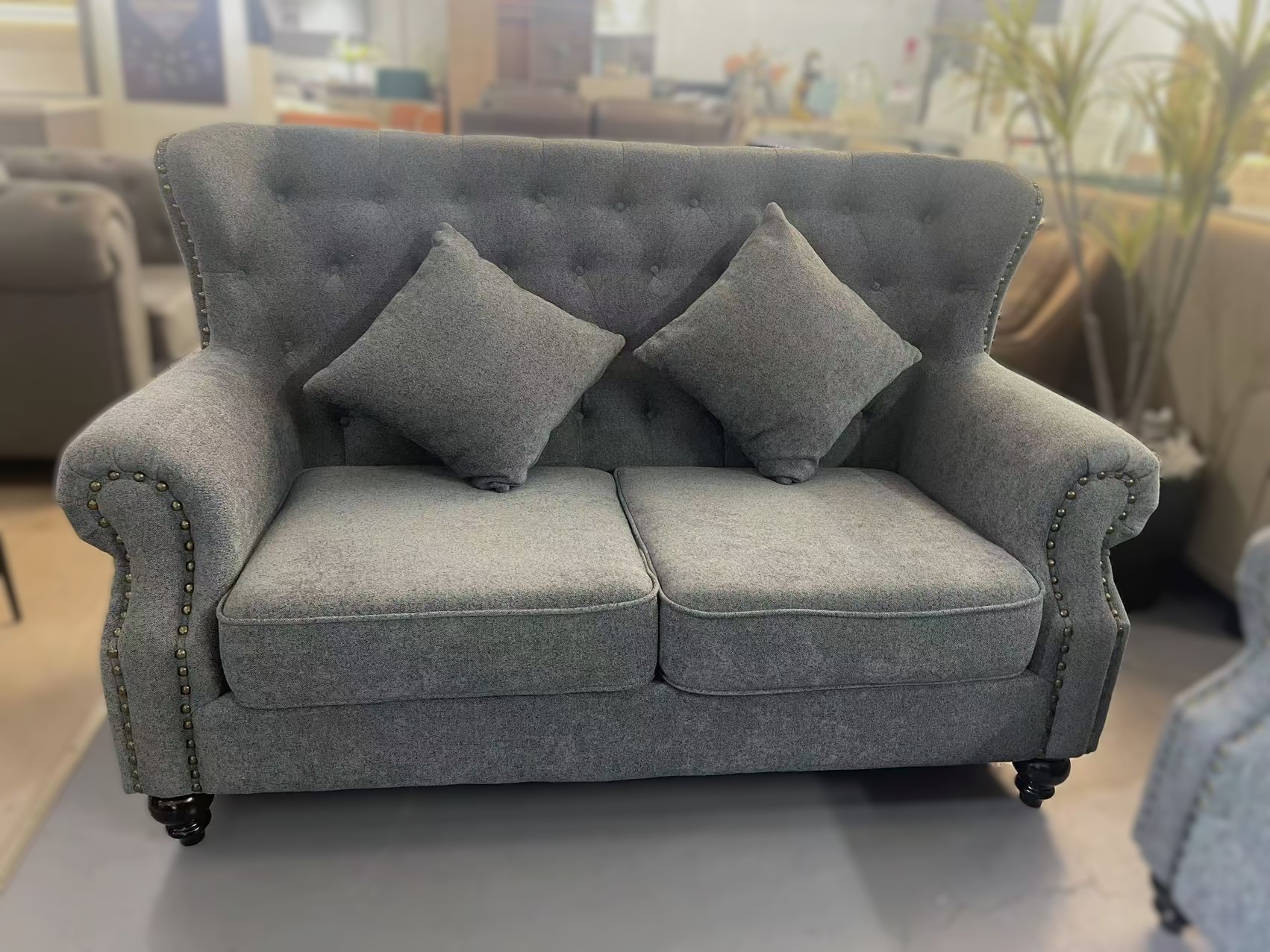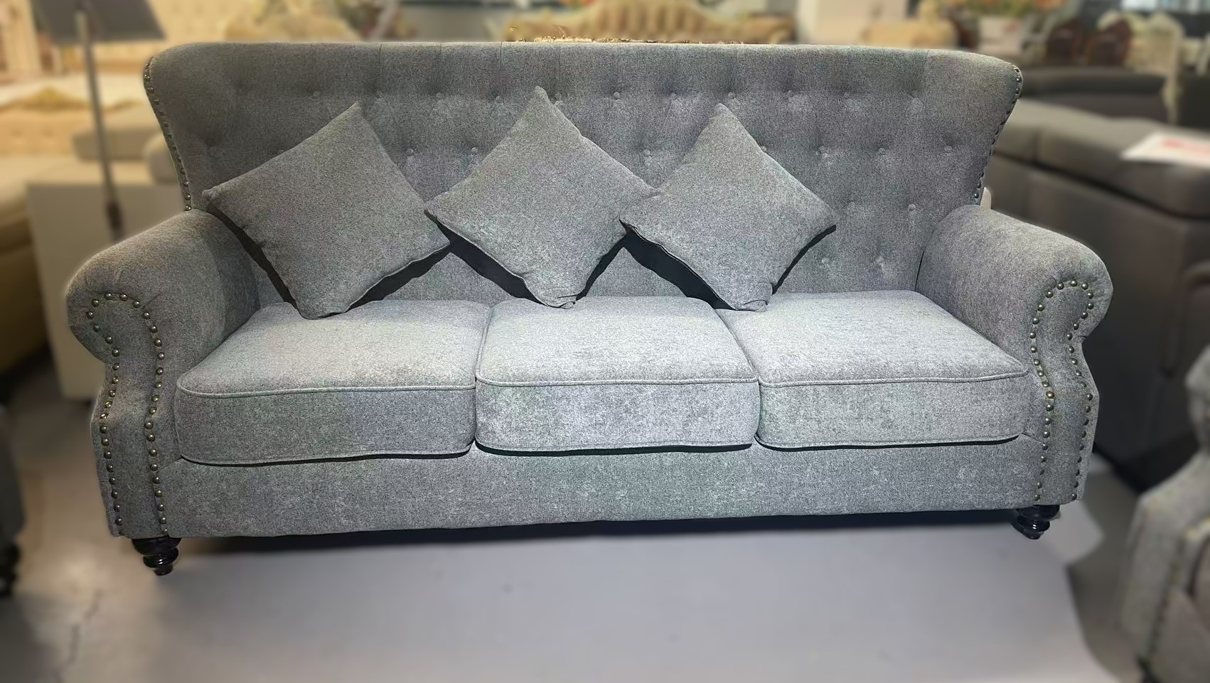 Product Description: Add a touch of timeless elegance to your living space with this stunning 3-piece Chesterfield high-back sofa suite. Inspired by classic British design, this set includes a luxurious 3-seater sofa, a 2-seater loveseat, and a beautifully crafted armchair, each offering the perfect blend of sophistication and comfort. Upholstered in a soft yet durable grey fabric, this suite brings a refined charm to any home, effortlessly complementing a wide range of interior styles from traditional to contemporary. The high-back design provides exceptional support for your back and shoulders, making it perfect for those who enjoy long, comfortable lounging sessions. The button-tufted detailing on the backrests adds an extra layer of sophistication, giving this suite its signature Chesterfield style, while the finely crafted rolled arms with nailhead trim offer a beautiful, classical finish. Each piece is fitted with plush, removable seat cushions, ensuring comfort without sacrificing the elegant aesthetic. Whether you are entertaining guests or enjoying a quiet evening at home, this suite is built to impress. The sturdy wooden legs ensure long-lasting stability, while the attention to detail in the fabric, stitching, and overall design makes this suite a true statement piece. Its neutral grey tone allows it to integrate seamlessly into a variety of living spaces, from cozy apartments to grand living rooms. The ample seating space provides room for families and friends to gather, making it the ideal choice for social events or relaxing nights in. Pair it with a soft rug, some decorative cushions, and a coffee table to create a sophisticated and inviting living space. Designed for both aesthetics and function, this Chesterfield high-back suite will elevate the style of your home for years to come. Key Features: 3-piece set: includes a 3-seater, 2-seater, and armchair Classic high-back design with button-tufted detailing for added elegance Soft grey fabric upholstery that is durable and easy to maintain Rolled arms with nailhead trim for a timeless, sophisticated look Removable seat cushions for easy cleaning and enhanced comfort Sturdy wooden legs for long-lasting support Perfect for both traditional and modern living spaces This Chesterfield high-back sofa suite is perfect for those who appreciate the marriage of classic style and modern comfort. Indulge in luxurious seating that not only enhances your home’s decor but also offers exceptional support and relaxation. 4o