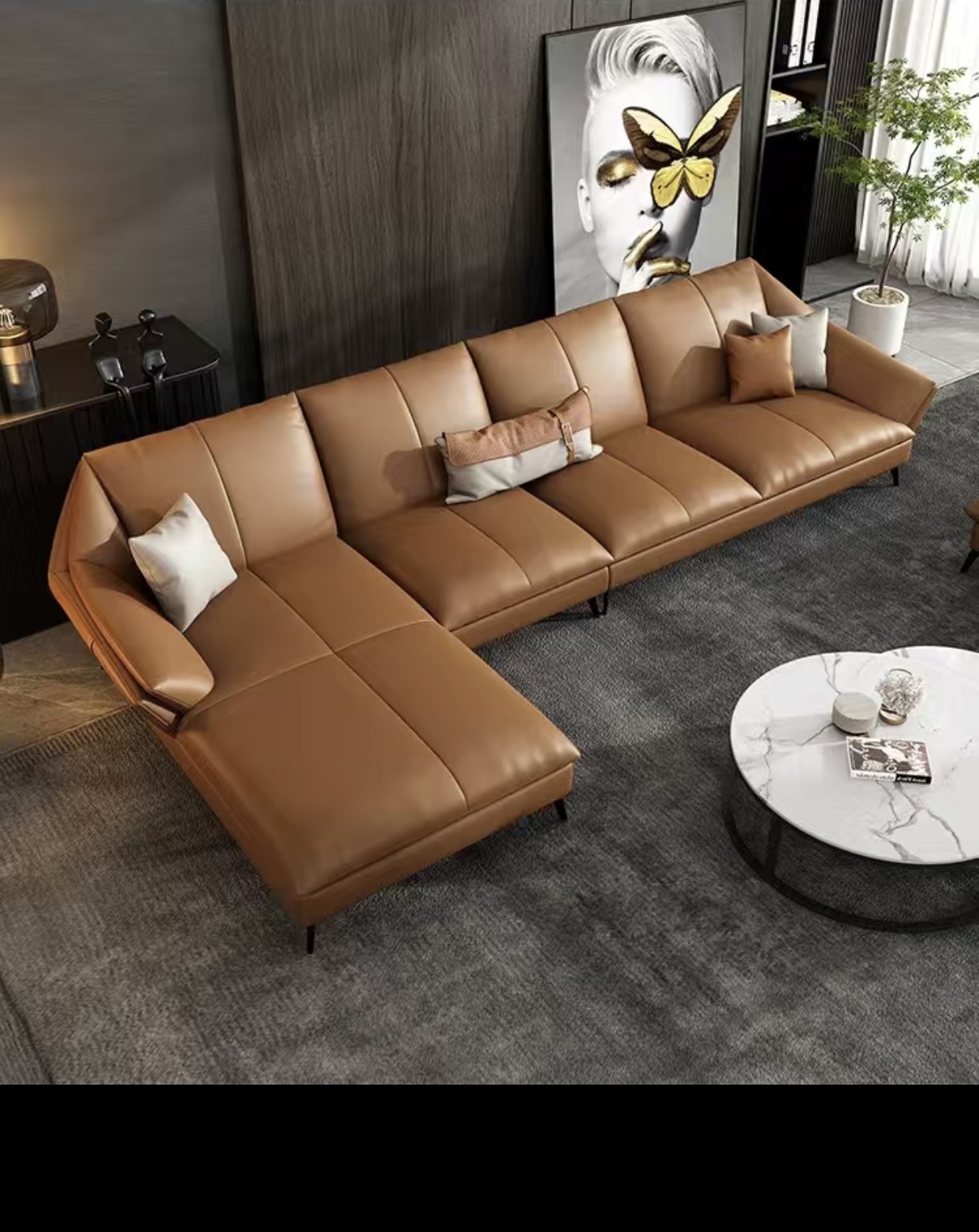 Italian-Designed Brown Leather Corner Lounge Suite Material: Genuine Leather covering all seating, arm rest and back rest area, other part is covered by leatherate. Size: 3.6m x 1.8m x 0.92m Elevate your living space with the Italian-Designed Brown Leather Corner Lounge Suite, a perfect blend of modern sophistication and timeless luxury. Crafted with meticulous attention to detail, this L-shaped sofa offers both style and comfort, making it the ideal centerpiece for any contemporary living room. The price is not including the single arm chairs and ottoman, the matching single arm chairs and ottoman can be ordered separately. Key Features: Italian Design: Expertly crafted with a focus on elegance and functionality, this lounge suite embodies the finest in Italian design, offering a luxurious and sophisticated addition to your home. Luxurious Leather Upholstery: The sofa is upholstered in premium brown leather, providing a soft, durable surface that is easy to maintain. The rich brown tone adds warmth and depth to your living space. Modern Aesthetic: With its clean lines and minimalist design, this corner lounge suite seamlessly fits into any modern interior. The sleek black legs add a touch of contrast and elevate the overall aesthetic. Spacious Seating: The L-shaped configuration provides ample seating for family and guests, making it perfect for both entertaining and relaxing. The plush cushions and supportive backrests ensure comfort for hours of lounging. Elegant Accents: The lounge is accessorized with stylish throw pillows that enhance both comfort and visual appeal, while the matching modern coffee table with a marble top adds a touch of elegance. Durable Construction: Built with a sturdy frame and high-quality materials, this lounge suite is designed to offer long-lasting durability and comfort. Bring a touch of Italian luxury to your home with the Italian-Designed Brown Leather Corner Lounge Suite. Its timeless design and premium materials make it a standout choice for any modern living space, offering both comfort and elegance. Single Arm Sofa $699 Ottoman $ 399