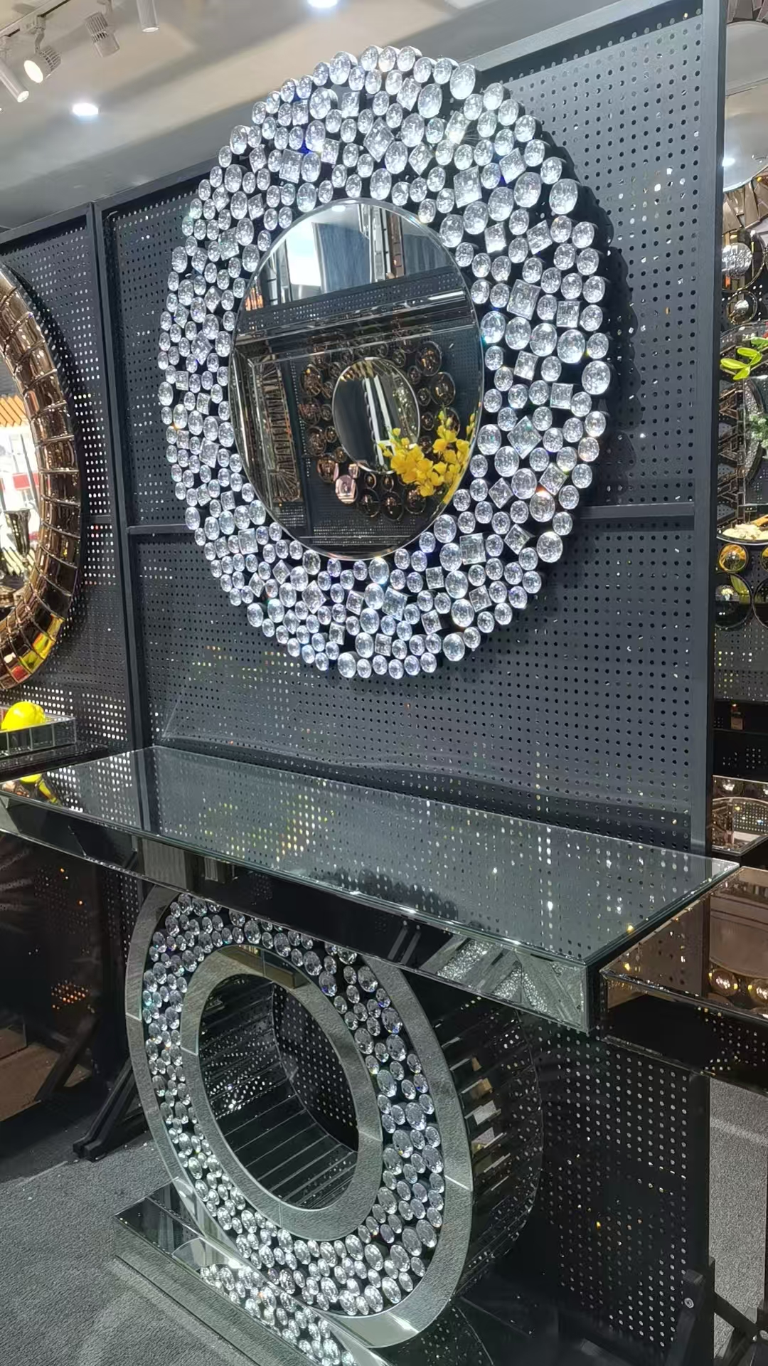 Description:Transform your entryway, living room, or dining area with this stunning mirrored console table and matching mirror set. Crafted with high-quality mirrored glass and accented with sparkling crystal details, this set adds instant glamour and creates a breathtaking focal point in any space. Key Features: Complete Set – Console table + matching mirror Luxury Finish – Mirrored surfaces with crystal/crushed diamond inlay Size – Console 120*40*82 cm 🏠 Perfect Placement – Ideal for hallways, lounges, dining rooms, or boutiques 🧽 Easy Care – Wipe clean with a soft cloth to maintain shine Why You’ll Love It:This mirrored console set is more than furniture – it’s a statement piece. The reflective surfaces brighten your room, while the crystal accents bring elegance and sophistication. Perfect for anyone who loves modern luxury living.